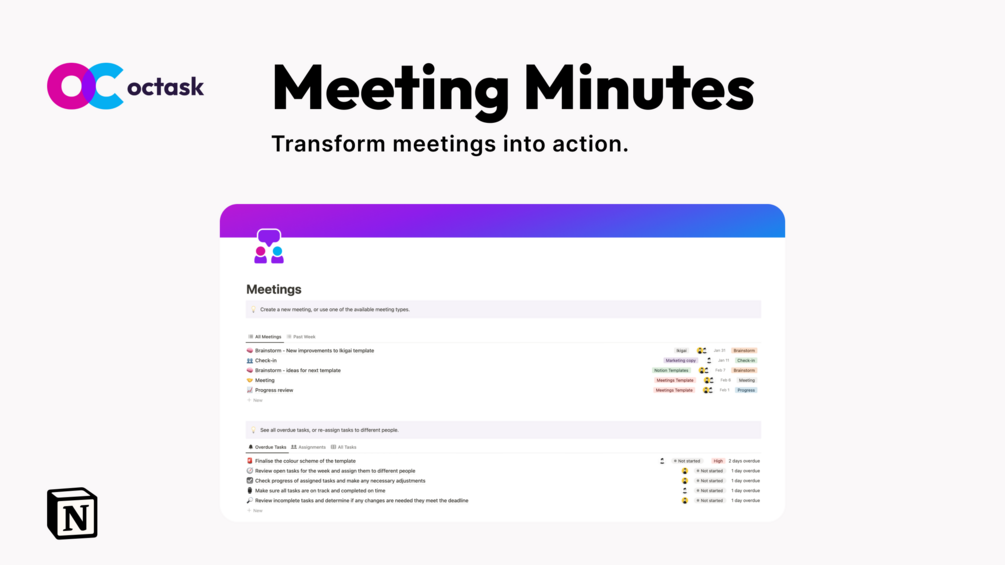 Introducing our solution for effective and efficient meetings - the OCTask Meeting Template. Whether you're looking to schedule a quick check-in or a detailed progress review, this template has got you covered. Say goodbye to scattered notes and disorganized agendas, and hello to streamlined, productive meetings.